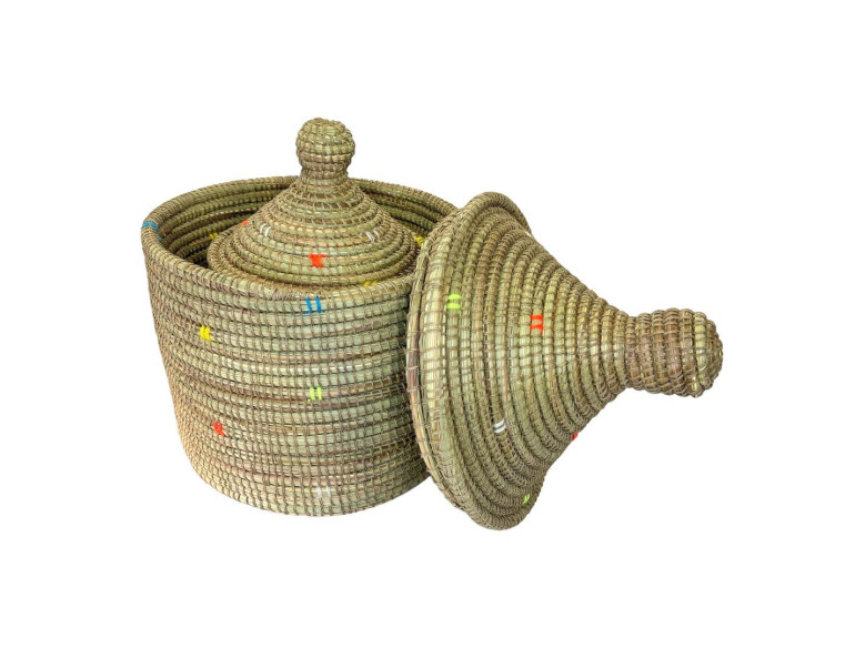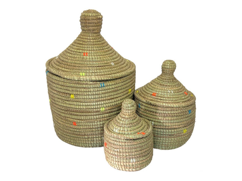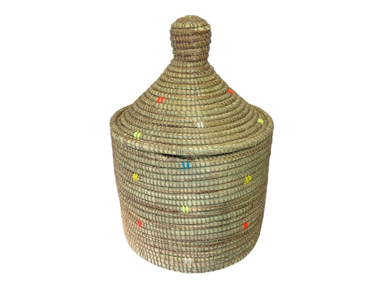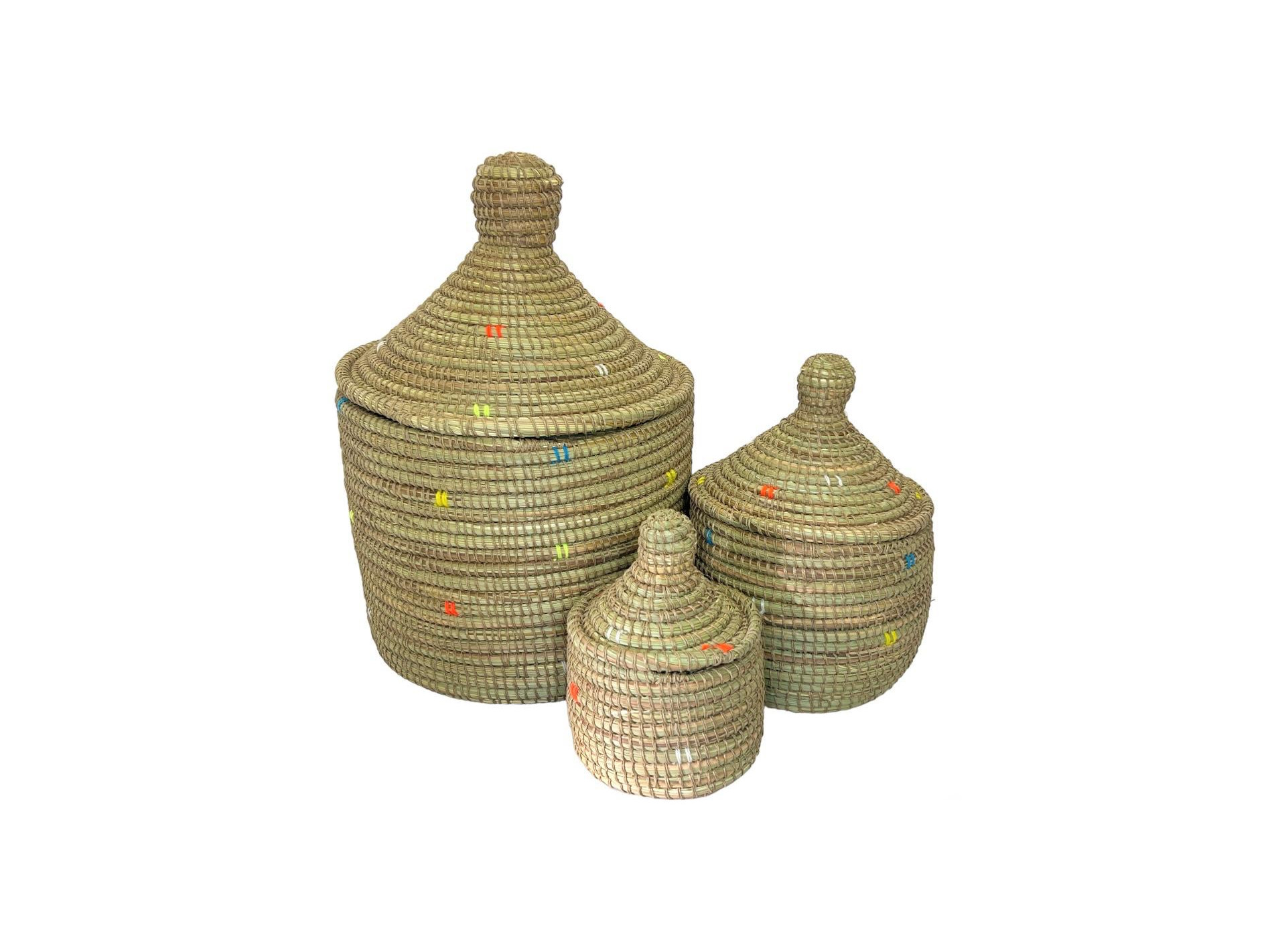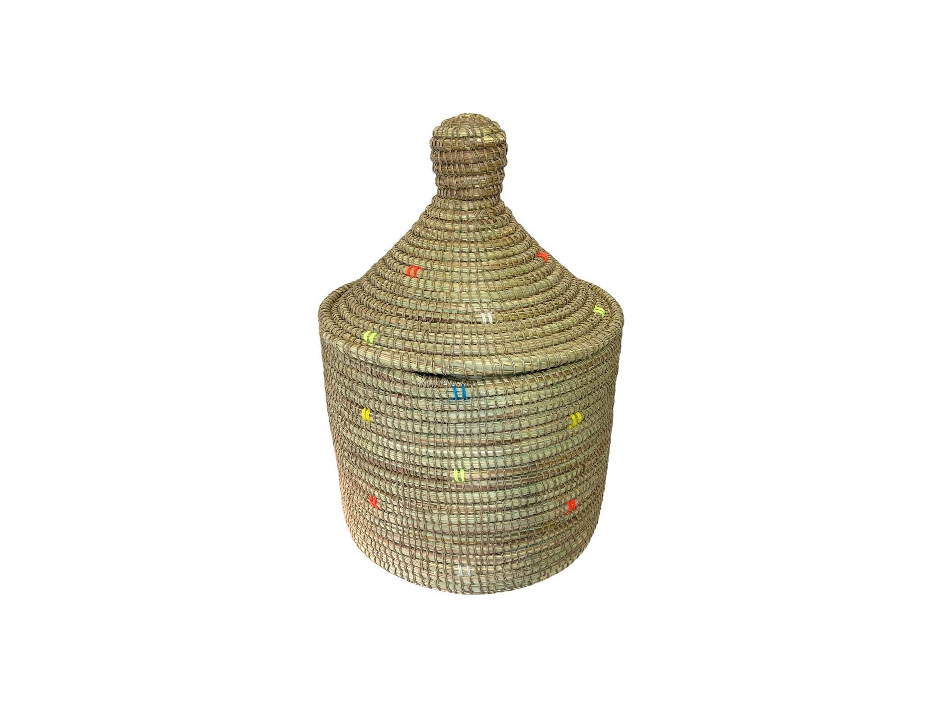 These handwoven baskets combine artisanal craftsmanship with natural elegance. Made from straw and adorned with colorful wool patterns, they are perfect for storage while adding a warm touch to your interior. Their signature conical lids keep your everyday items stylishly concealed. Available in various sizes and designs, they blend seamlessly into any decor.