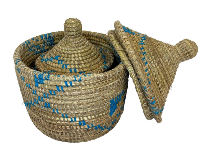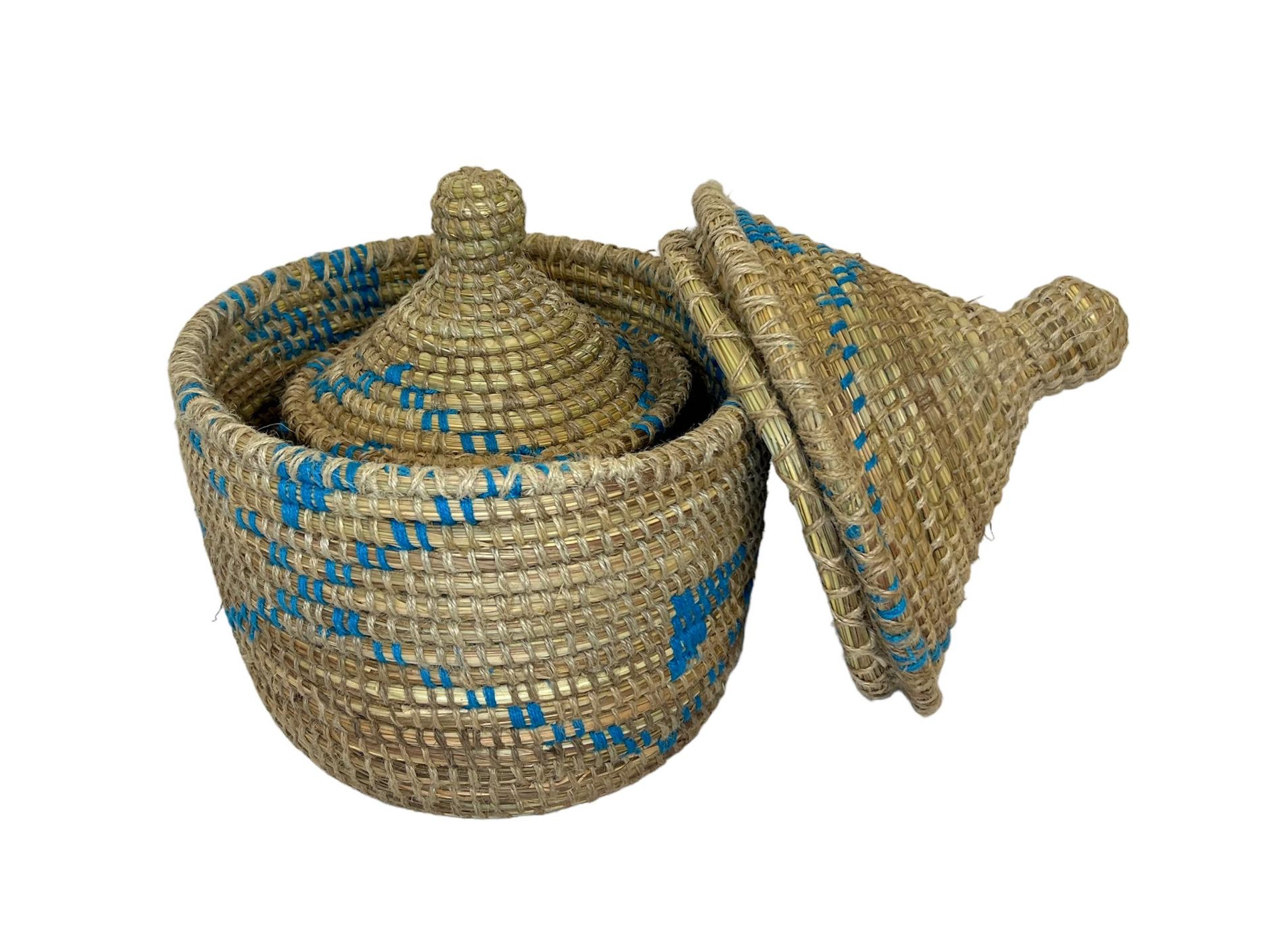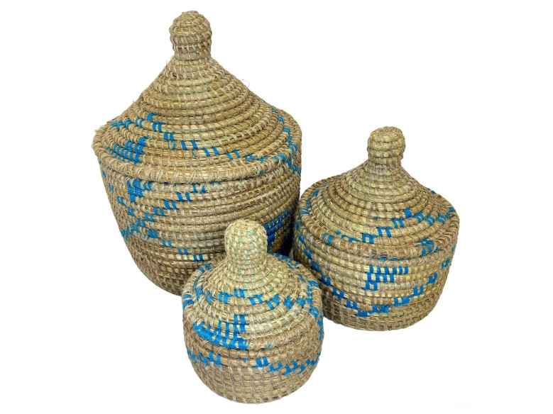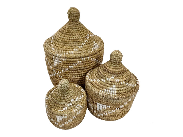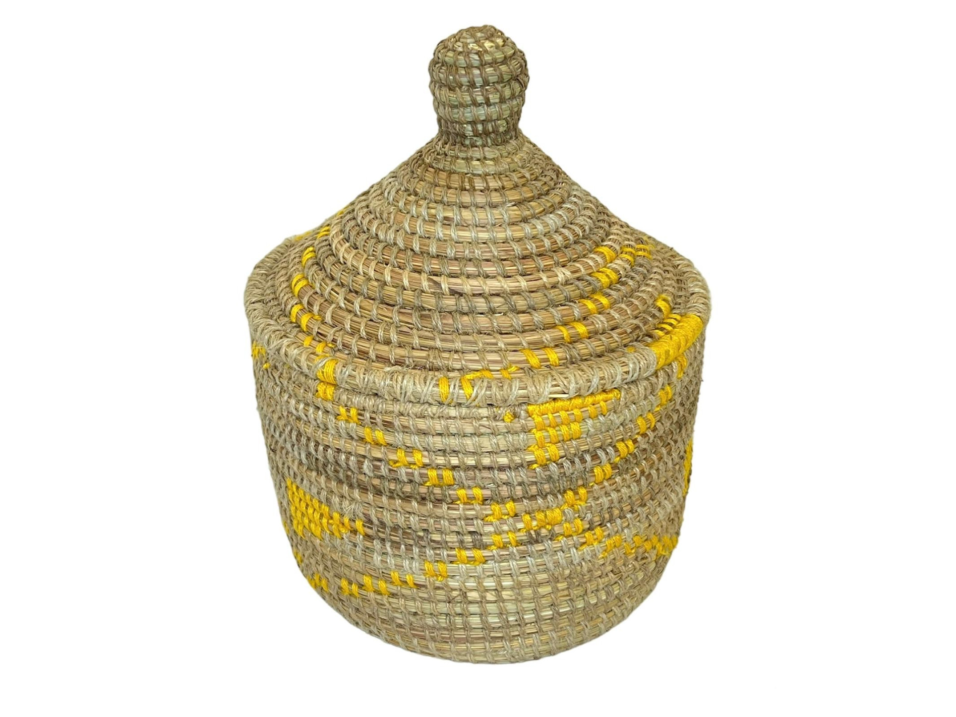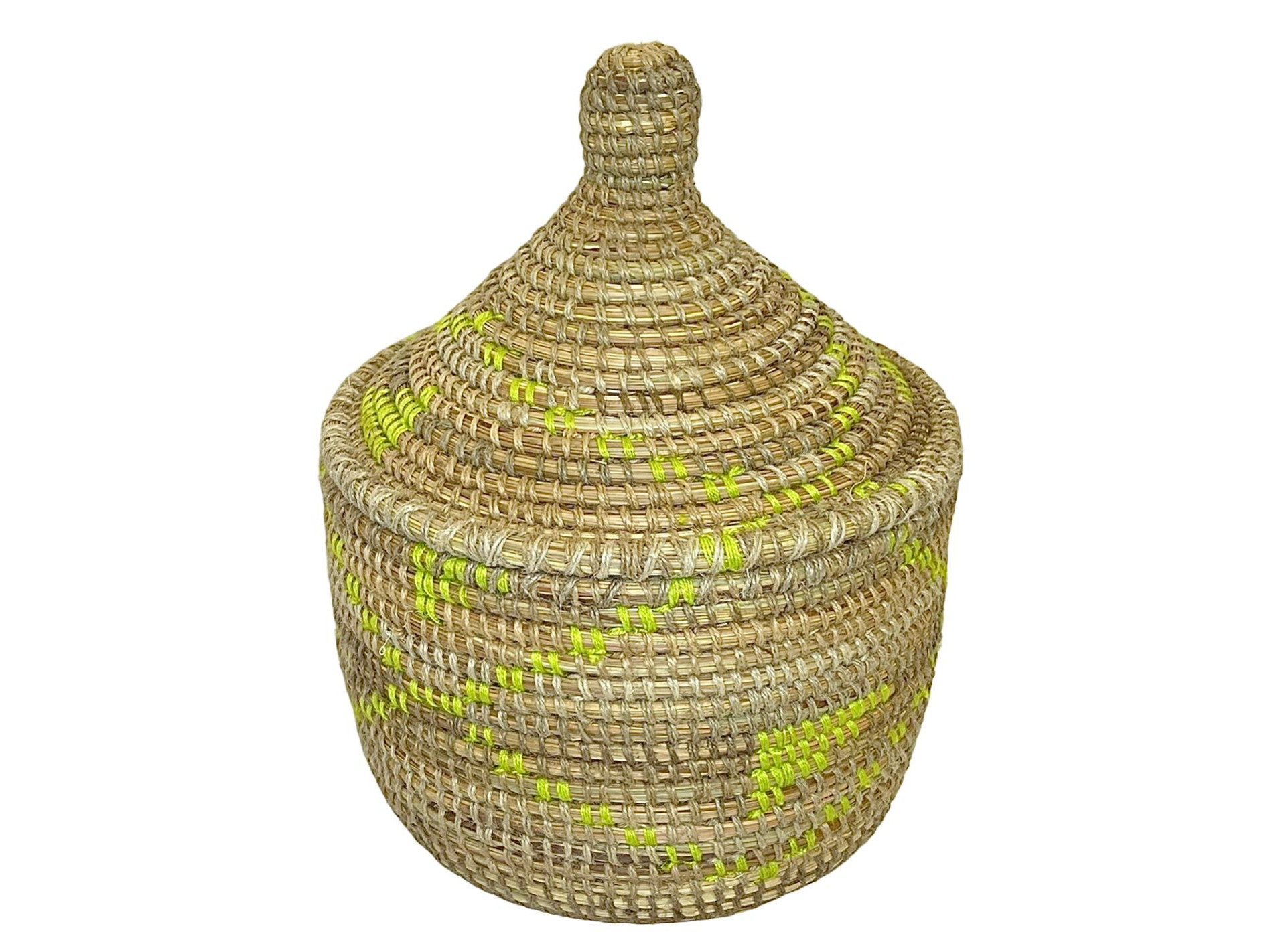 These handwoven baskets combine artisanal craftsmanship with natural elegance. Made from straw and adorned with colorful wool patterns, they are perfect for storage while adding a warm touch to your interior. Their signature conical lids keep your everyday items stylishly concealed. Available in various sizes and designs, they blend seamlessly into any decor.
