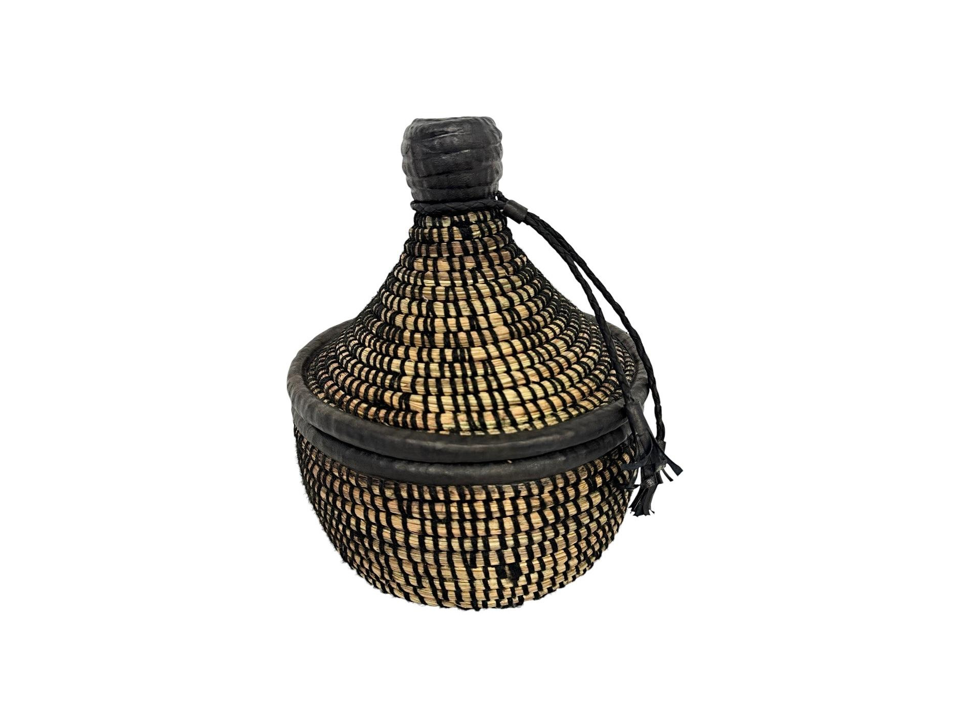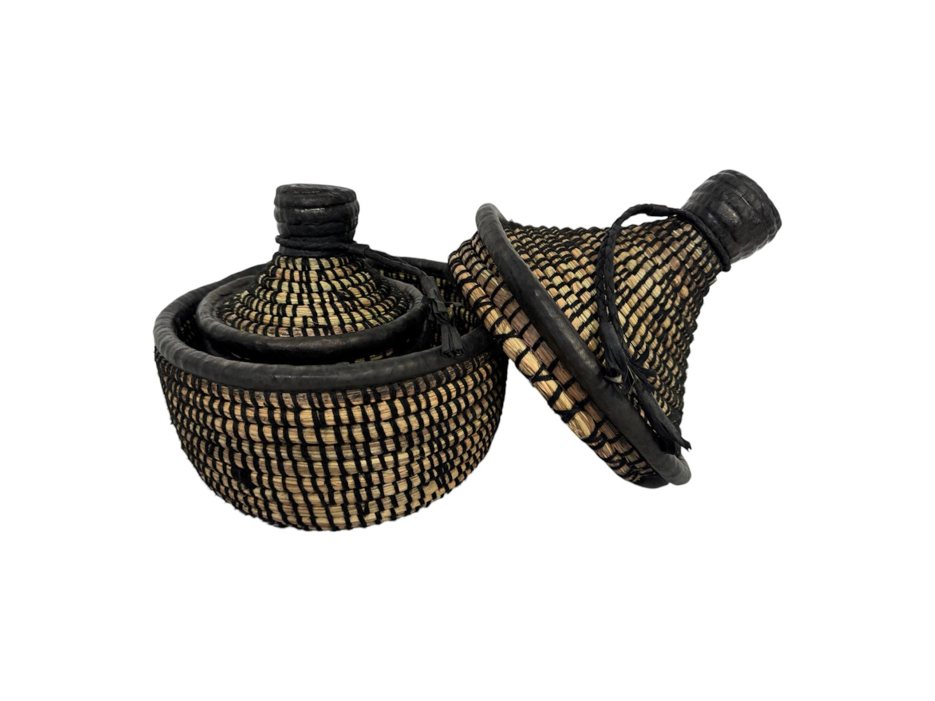Set de boîtes gigognes avec couvercles, tissées à la main en paille et sublimées par des finitions en cuir. Leur design élégant et leur fabrication artisanale en font des objets aussi décoratifs que pratiques pour le rangement. Chaque pièce est unique et met en valeur un savoir-faire traditionnel.