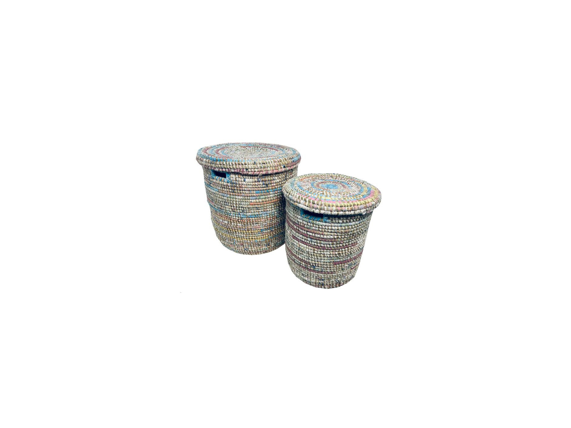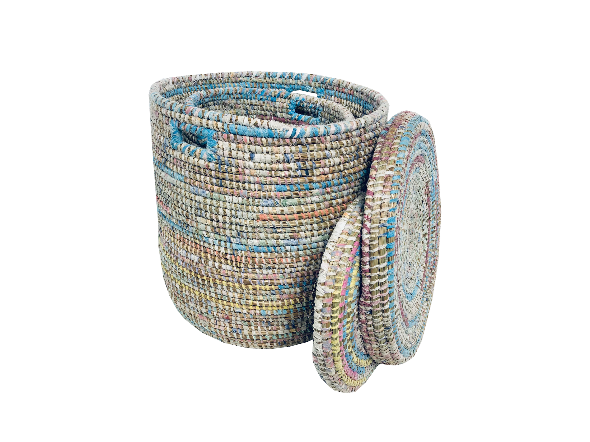 La corbeille Salandère est mise en valeur avec la paille naturelle et tissé avec des vieux draps collectés A savoir, l'Afrique c'est 10 000 tonnes d'importations de fripe chaque année. Notre surconsommation d'habits a donné naissance à cette collection. Cette initiative écologique circulaire vise à réduire les déchets tout en créant des objets de décoration. Vous apprécierez l'esthétisme du produit et le tissage parfait du tissu ! Dotée d'une grande contenance, à vous maintenant de trouver quel usage vous assignerez à votre corbeille traditionnelle.